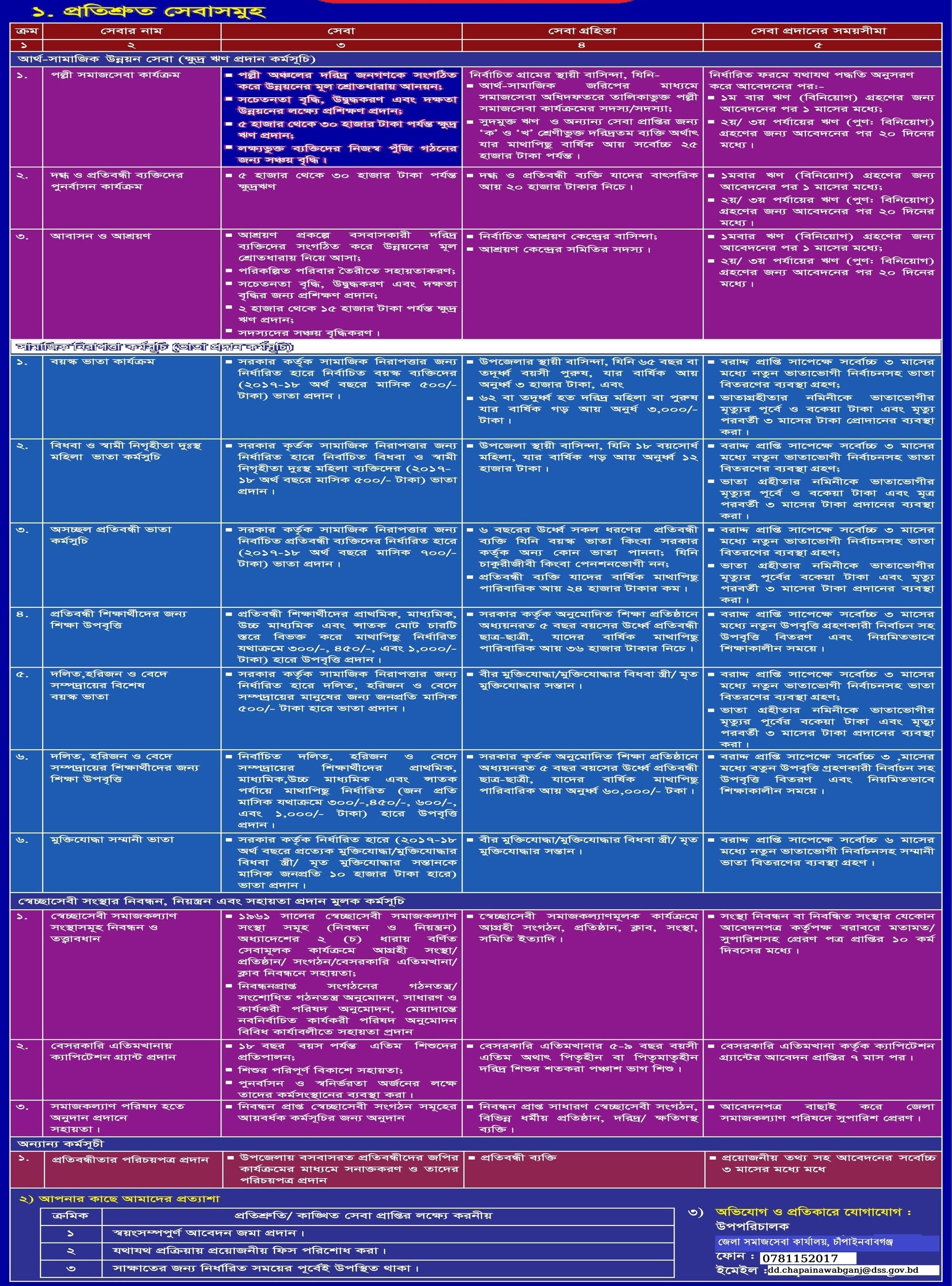 | ১ | পল্লীসমাজ সেবা (আর,এস,এস) কার্যক্রম | ক) পল্লীঅঞ্চলের দরিদ্র জনগণকে সংগঠিত করে উন্নয়নের মূল শ্রোতধারায় আনায়ন খ) সচেতনতা বৃদ্ধি, উদ্বুদ্ধকরণ এবং দক্ষতা উন্নয়নের লক্ষেপ্রশিক্ষণ প্রদান গ) ৫ হাজার হতে ১০ হাজার টাকা পর্যন্তক্ষুদ্রঋণ প্রদান ঘ) লক্ষ্যভূক্ত ব্যক্তিদের নিজস্ব পুঁজি গঠনের জন্য সঞ্চয় বৃদ্ধিকরণ | নির্বাচিত গ্রামের স্থায়ী বাসিন্ধা যিনিঃ ক) আর্থ সামাজিক জরিপেরমাধ্যমে উপজেলা সমাজসেবা কার্যালয়ের তালিকাভূক্ত পল্লীসমাজসেব কার্যক্রমের কর্মদলের সদস্য/সদস্যা খ) সুদ মুক্ত ঋণ ও অন্যান্য সেবা প্রাপ্তির জন্য ‘‘ক’’ ও ‘‘খ’’ শ্রেণীভূক্ত দরিদ্রতম ব্যক্তি অর্থাৎ যার মাথাপিছু বার্ষিক পারিবারিক আয় সর্বোচ্চ ২৫ হাজার টাকা পর্যন্ত গ) সুদ মুক্ত ঋণ ব্যতীত অন্যান্য সেবা প্রাপ্তির জন্য গ শ্রেণীভূক্ত অর্থাৎ যার মাথাপিছু বার্ষিক পারিবারিক আয় ২৫ হাজার টাকার উর্ধে | নির্ধারিতফরমে যথাযথ পদ্ধতি অনুসরণ করে আবেদনের পরঃ ক) ১ম বার ঋণ (বিনিয়োগ) গ্রহনের জন্য আবেদনের পর ১ (এক)মাসেরমধ্যে